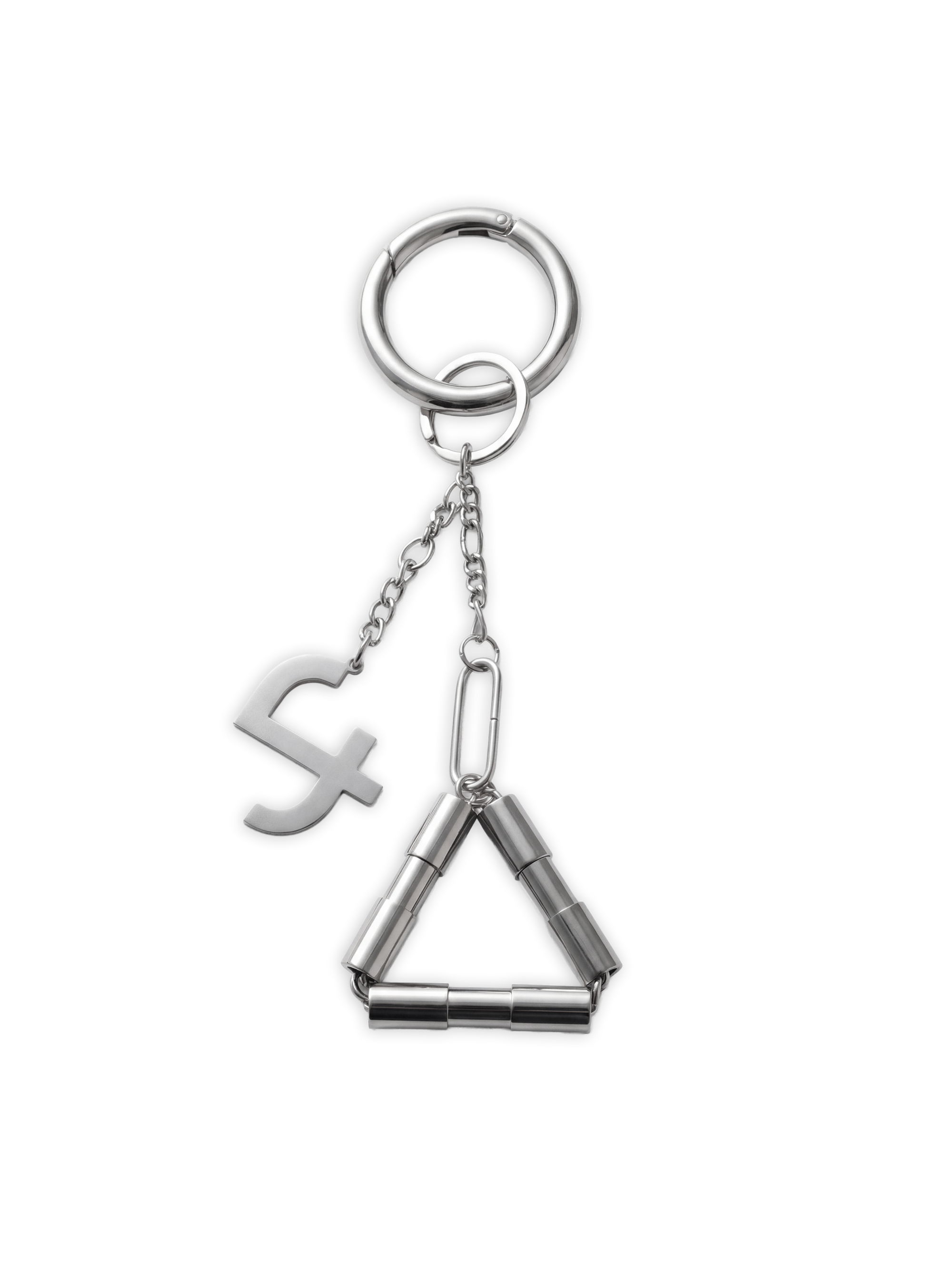 This geometric bag charm / keyring features a minimalist triangle made of stainless steel segments, accompanied by the THEFOUR’s signature icon charm. It can be used both as a decorative bag accessory or as a statement key holder.