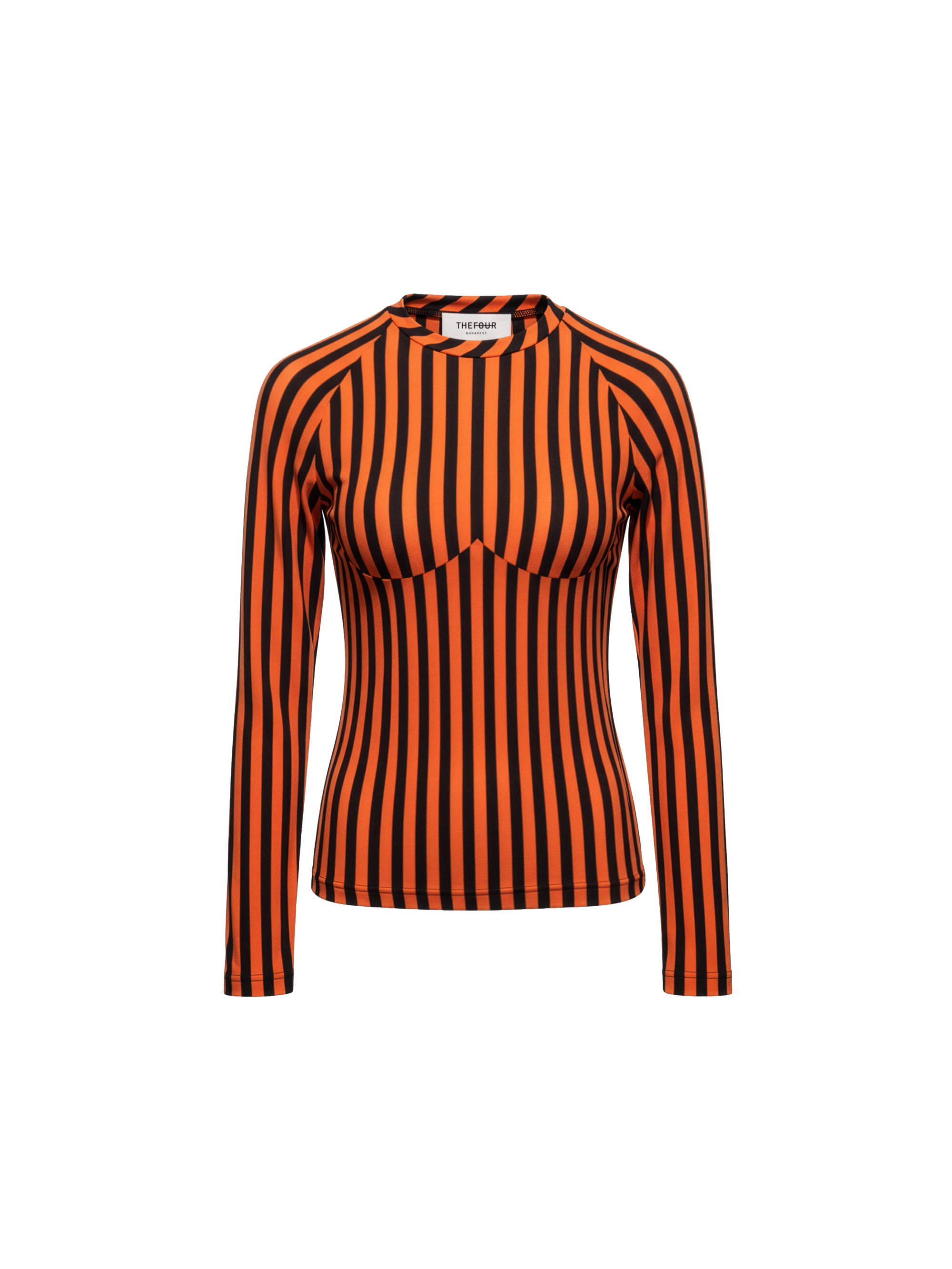 Form meets friction. The CONTOUR Top is cut from soft stretch jersey with vertical black and vivid orange stripes that follow the body’s lines with graphic precision. Subtle contour seams create a sculpted bust shape without structure or padding. A bold, fitted silhouette with unexpected flow — made to stand out under tailoring or worn solo.