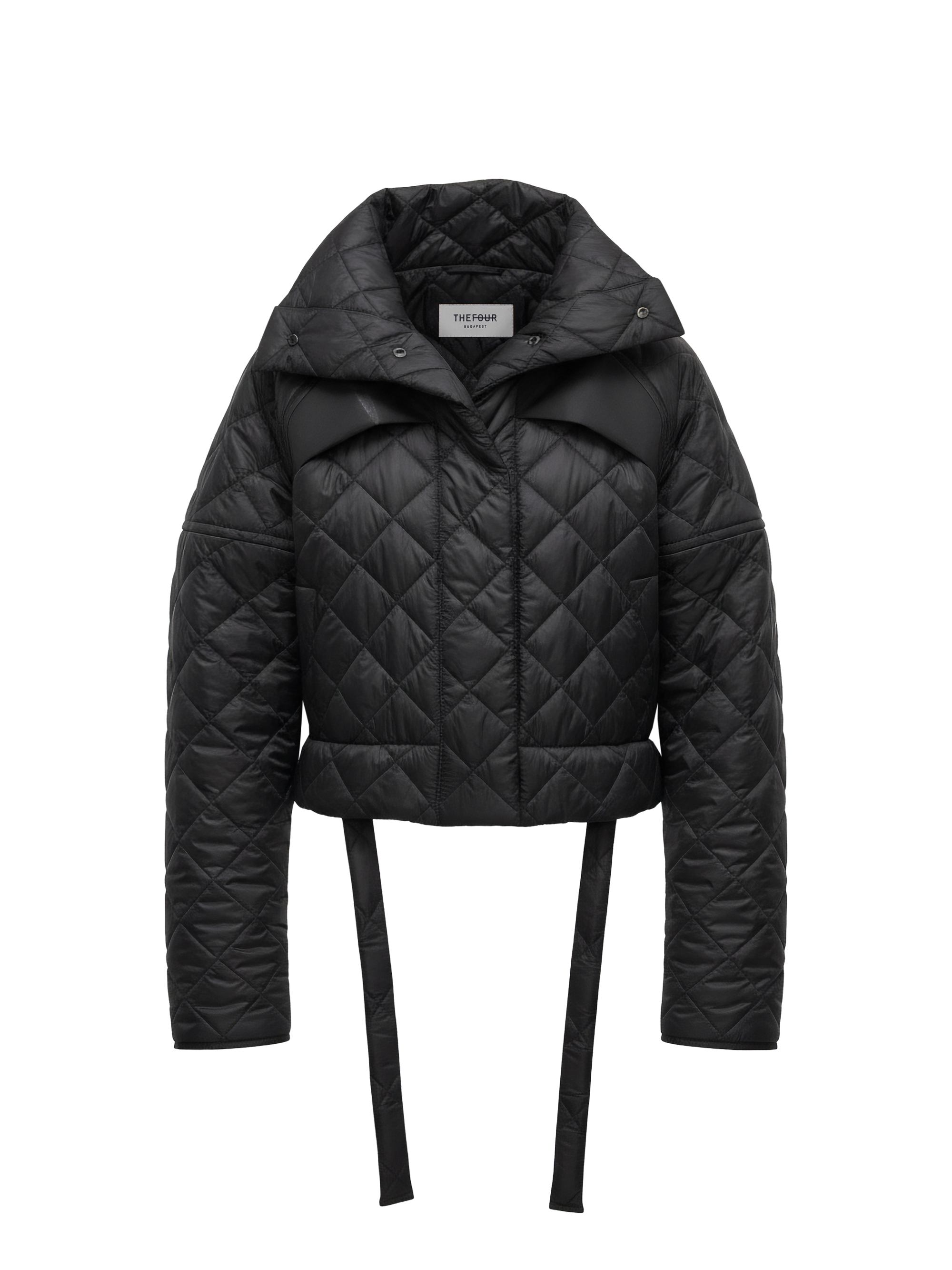 Cropped technical jacket made from a three-layer quilted fabric, unlined for a lightweight feel. Designed with a wide collar and sculptural silhouette. Features two inner pockets and a long adjustable drawstring emerging from the hemline for a functional yet distinctive detail. Closes with press buttons at the front.