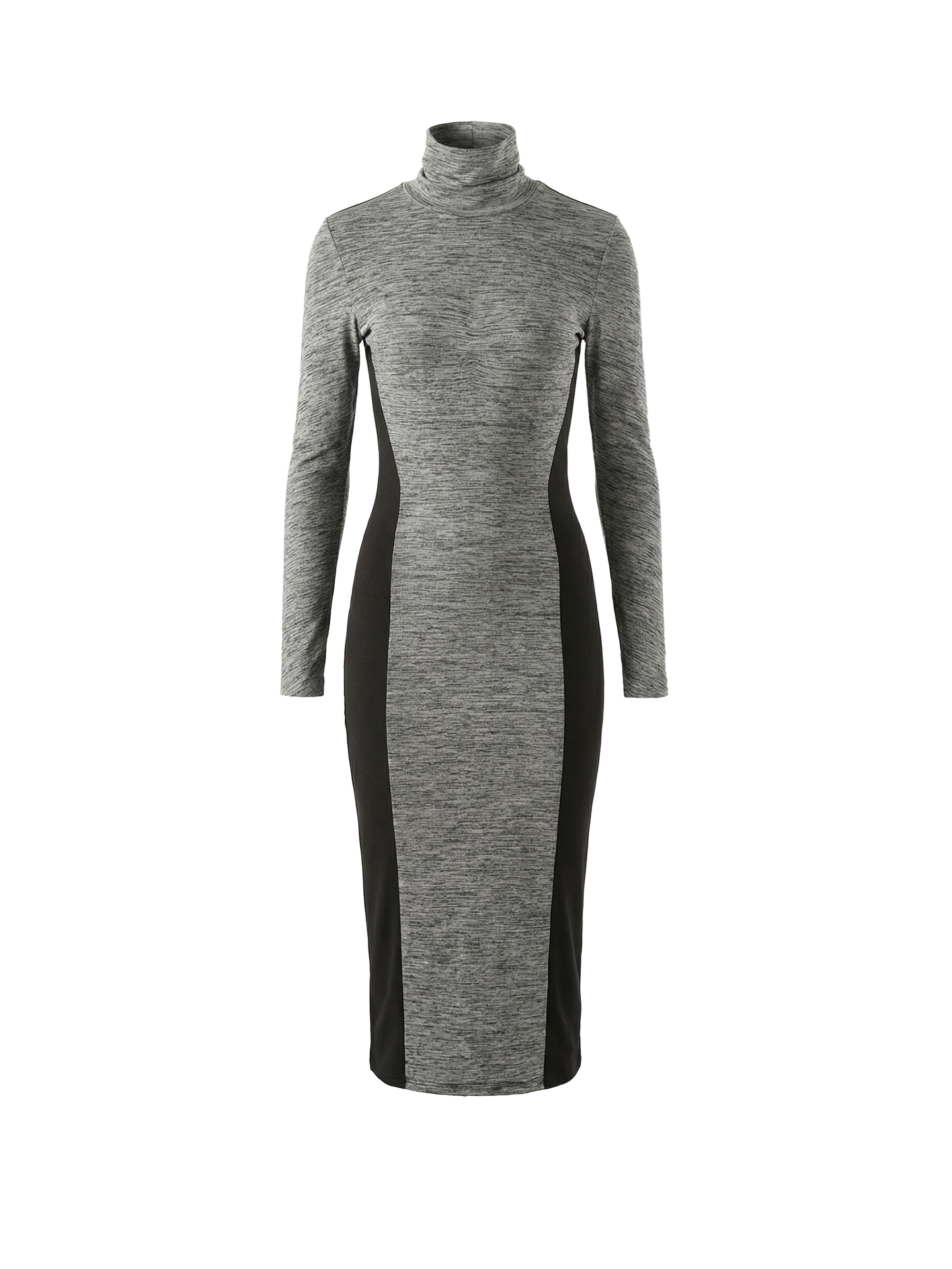 A slim-fit midi dress crafted from soft and stretchy polyester jersey. The silhouette is clean yet sharp, with sculpting contrast panels and a high neckline. The glitch-effect fabric runs through the front and sleeves, while the back is made from solid black. Designed for comfort and flexibility, this piece works equally well on its own or layered under outerwear.