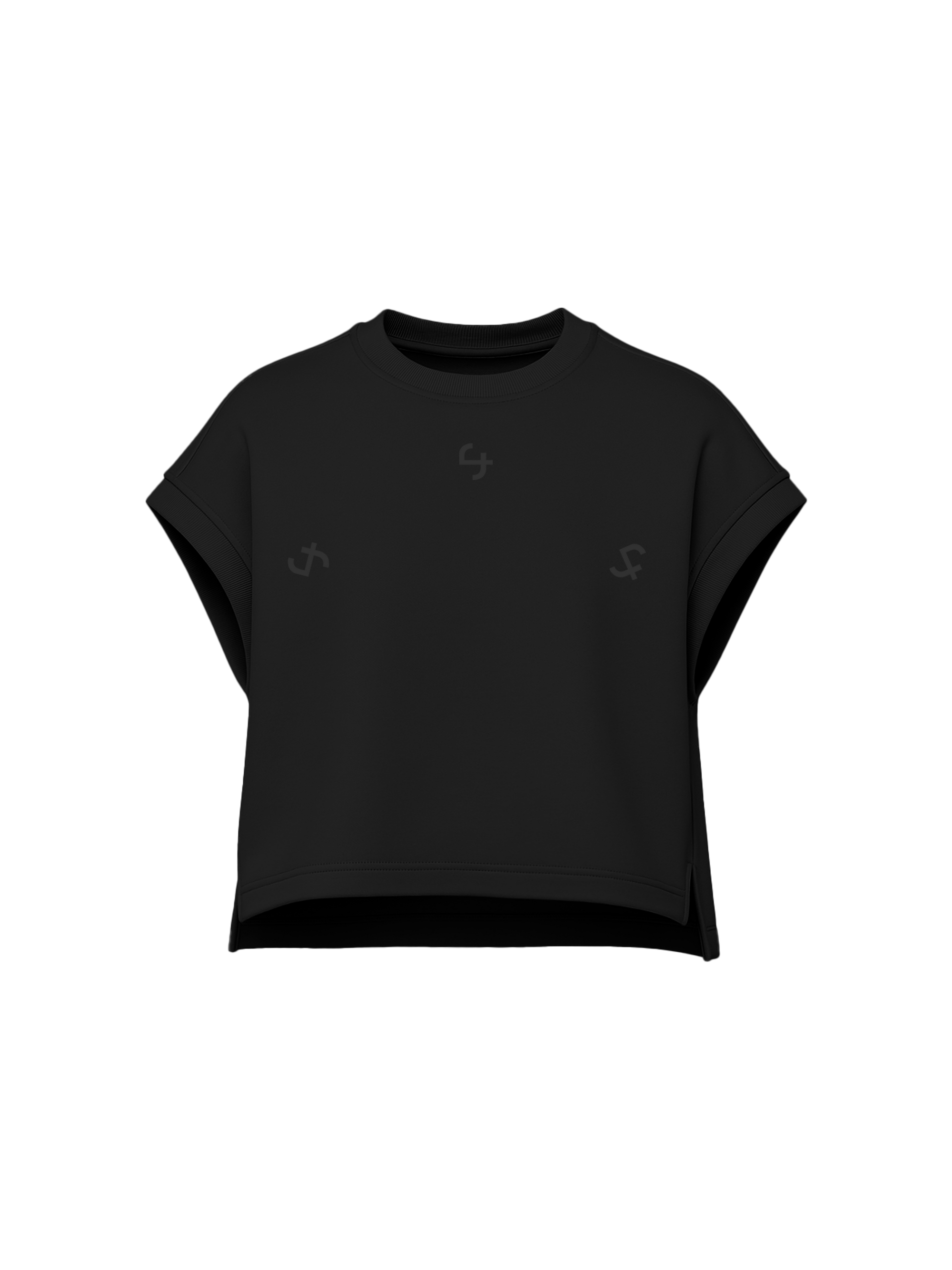 Sleeveless oversized top made from soft cotton fleece. Designed with a sculptural A-line silhouette, it features ribbed binding both at the neckline and the wide armholes – creating a mirrored, clean-cut shape that defines the piece. The signature THEFOUR symbol appears in three places across the chest, referencing the brand’s usual neckline placement and evoking a sense of multiplied identity. Minimal yet striking, the LUMA Top balances softness with a conceptual edge.