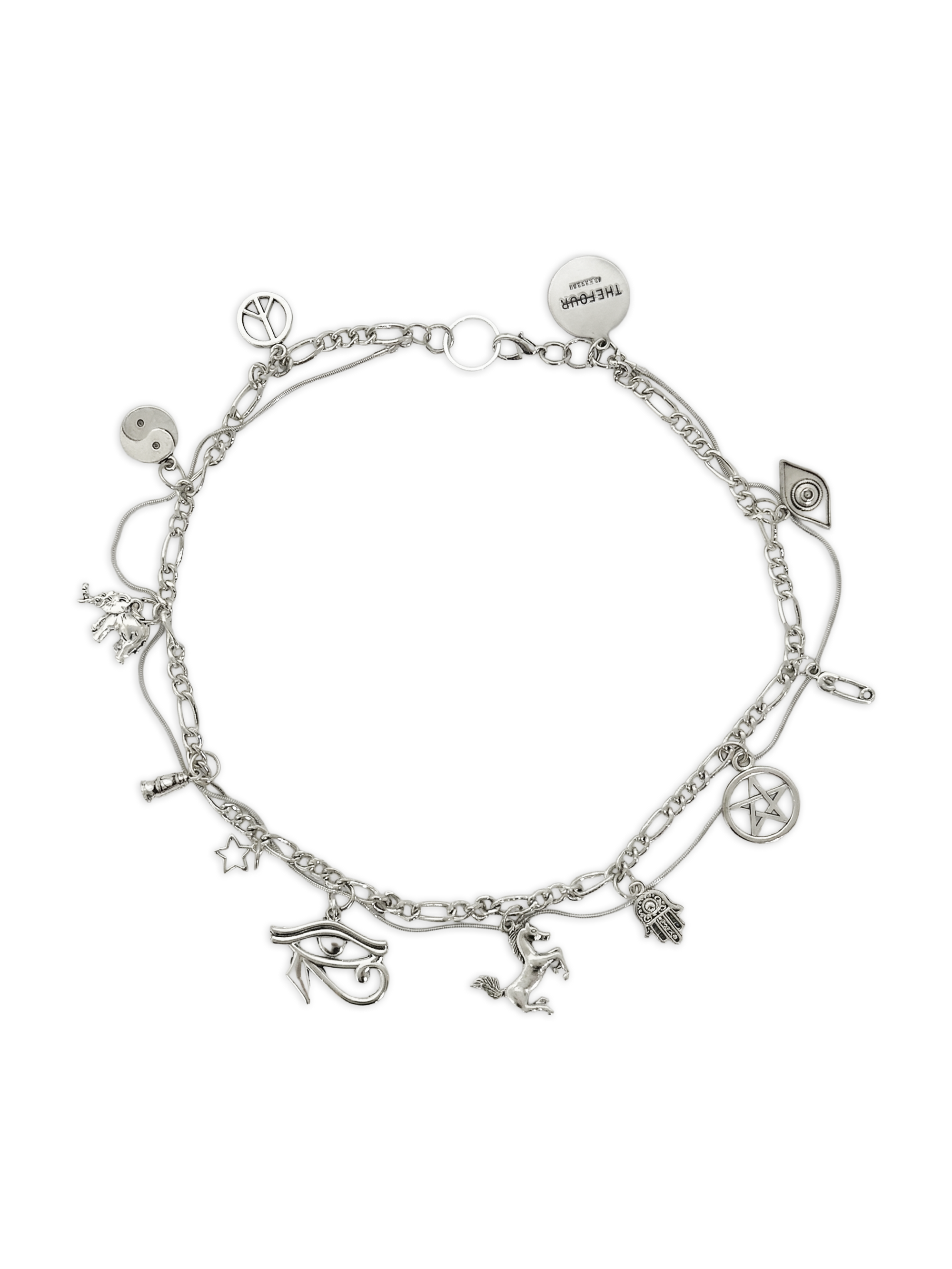 An eclectic necklace adorned with symbolic charms—from ancient signs to modern icons—this silver-tone piece brings together mysticism and attitude. Its layered design features two types of chain and a variety of meanings, from the Eye of Horus to the Hamsa hand and a tiny horse. Wear it to add an irreverent twist to minimal looks or to double down on maximalism.