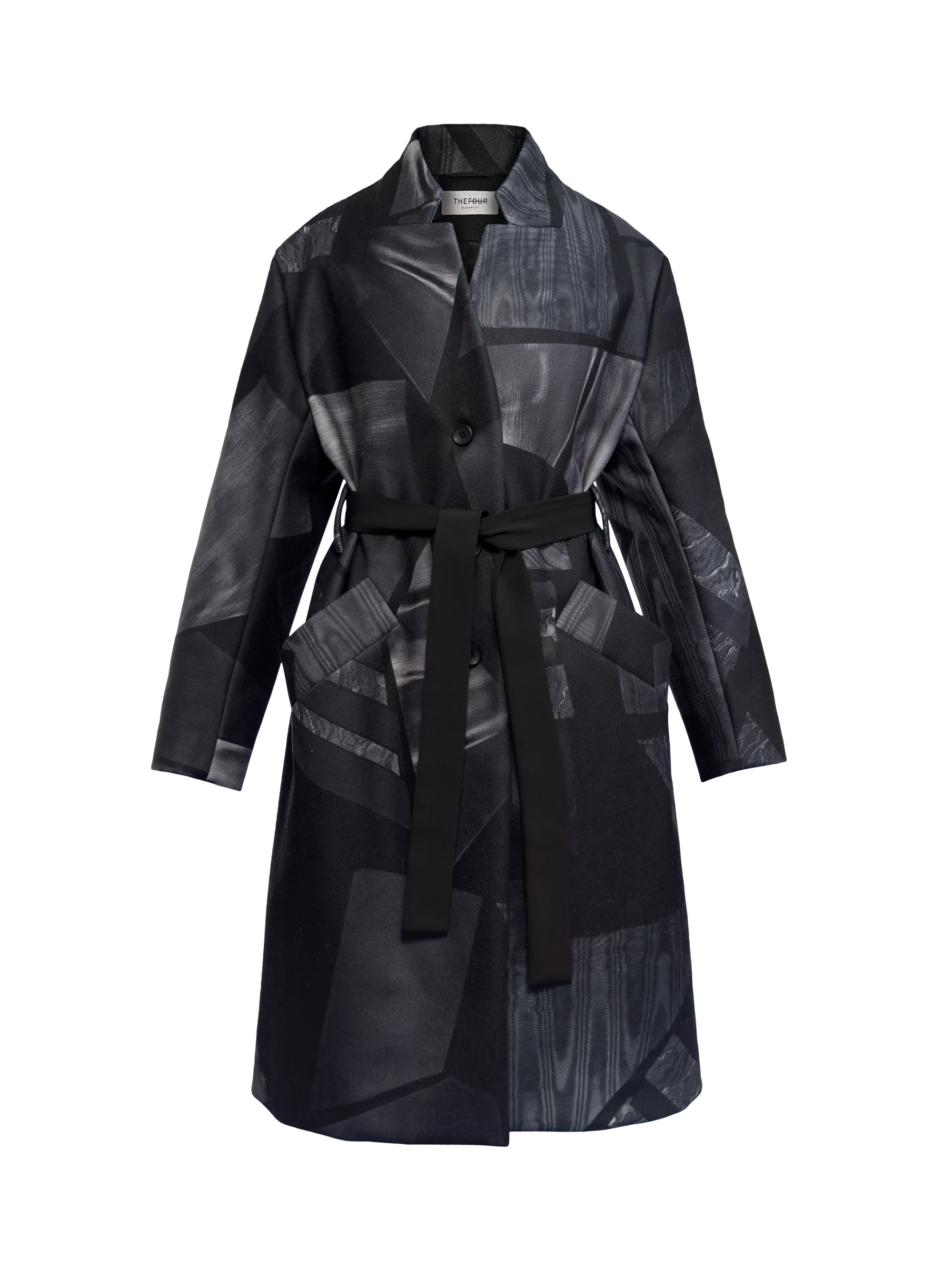 Straight fit coat made of unique printed textile. Inverted lapel collar and long sleeves with buttoned opening. The back detail features sewn-in crossed belts and a leather label. Characteristic front welt pockets. Back vent at the hem.
