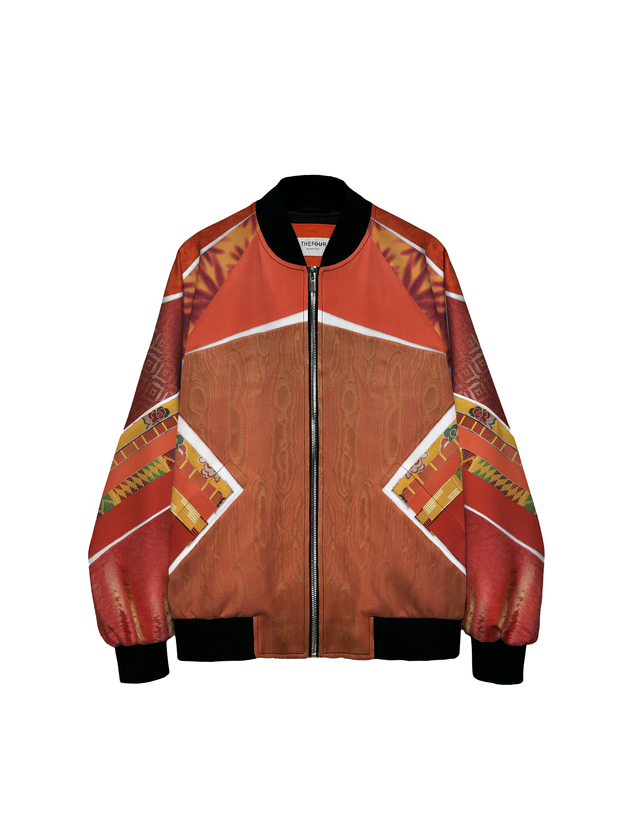 Loose-fit jacket with a contrasting print, created from photographed elements of our ALFA patchwork jacket. The photos were taken during the cutting process, capturing the deconstructed details. Features batwing sleeves and a standing collar, inspired by early ‘90s windbreakers. Designed with two front pockets, an elastic waist hem, and ribbed cuffs for a comfortable fit.
